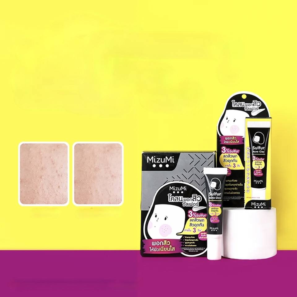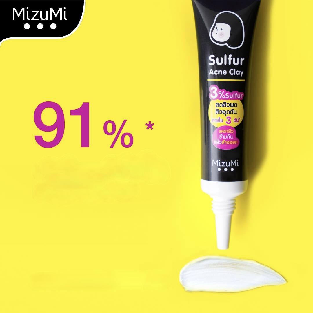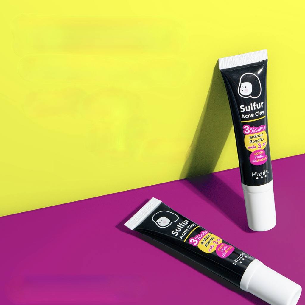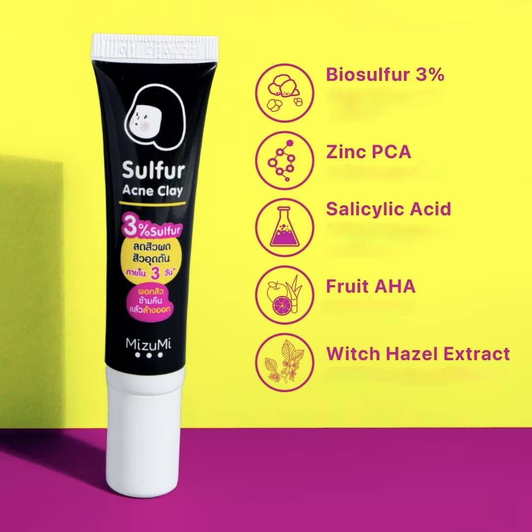 Le tube noir de MizuMi Sulphur Acne Clay réduit les boutons et les pores obstrués en 3 jours.