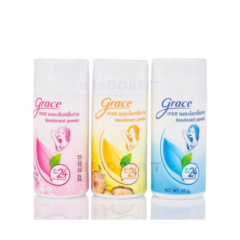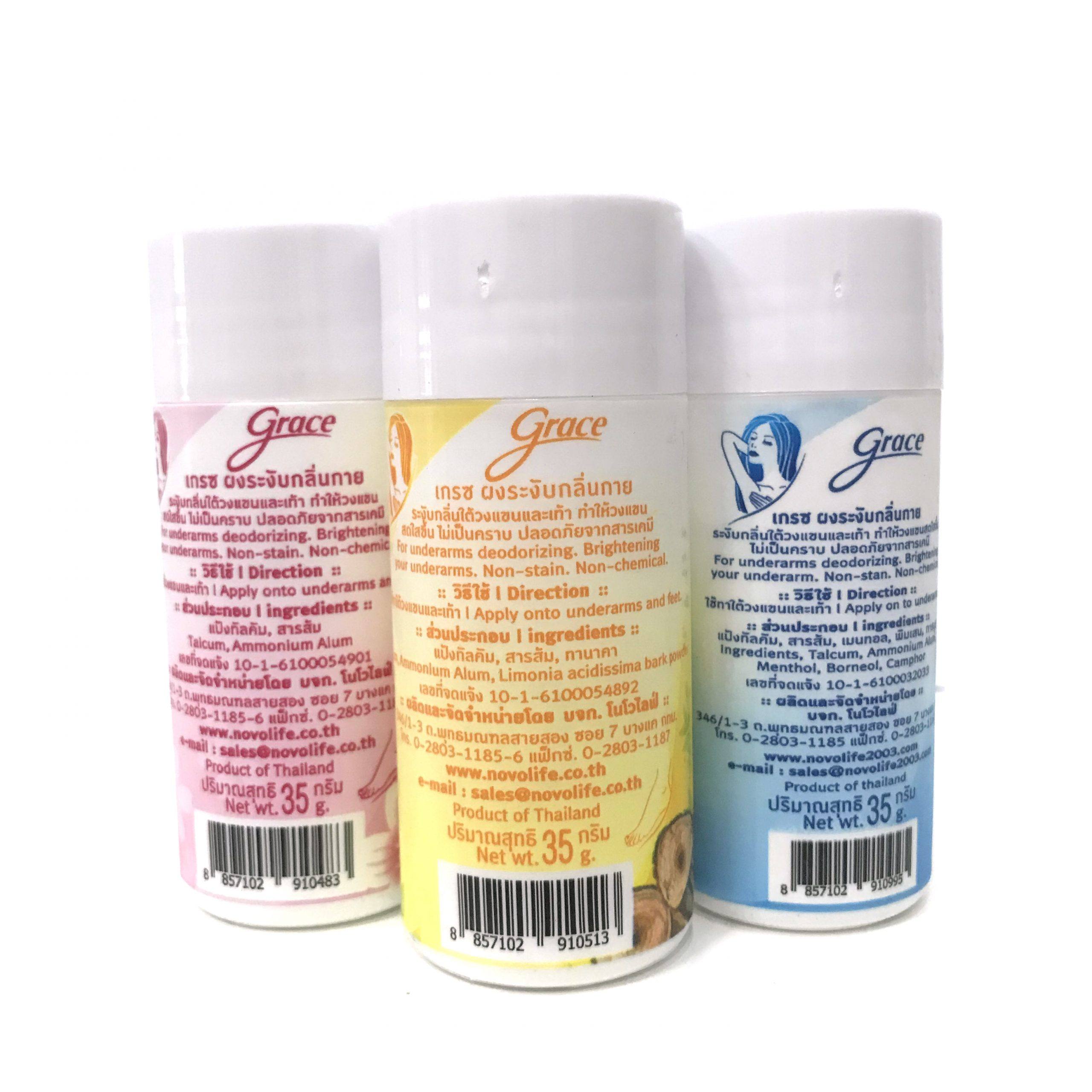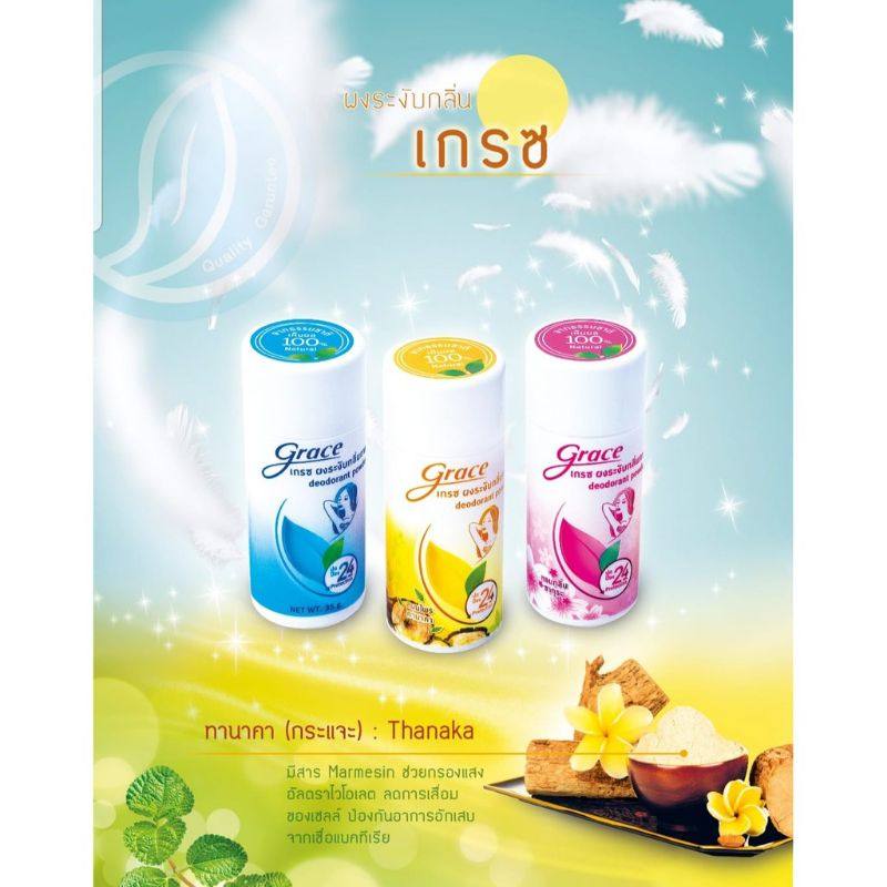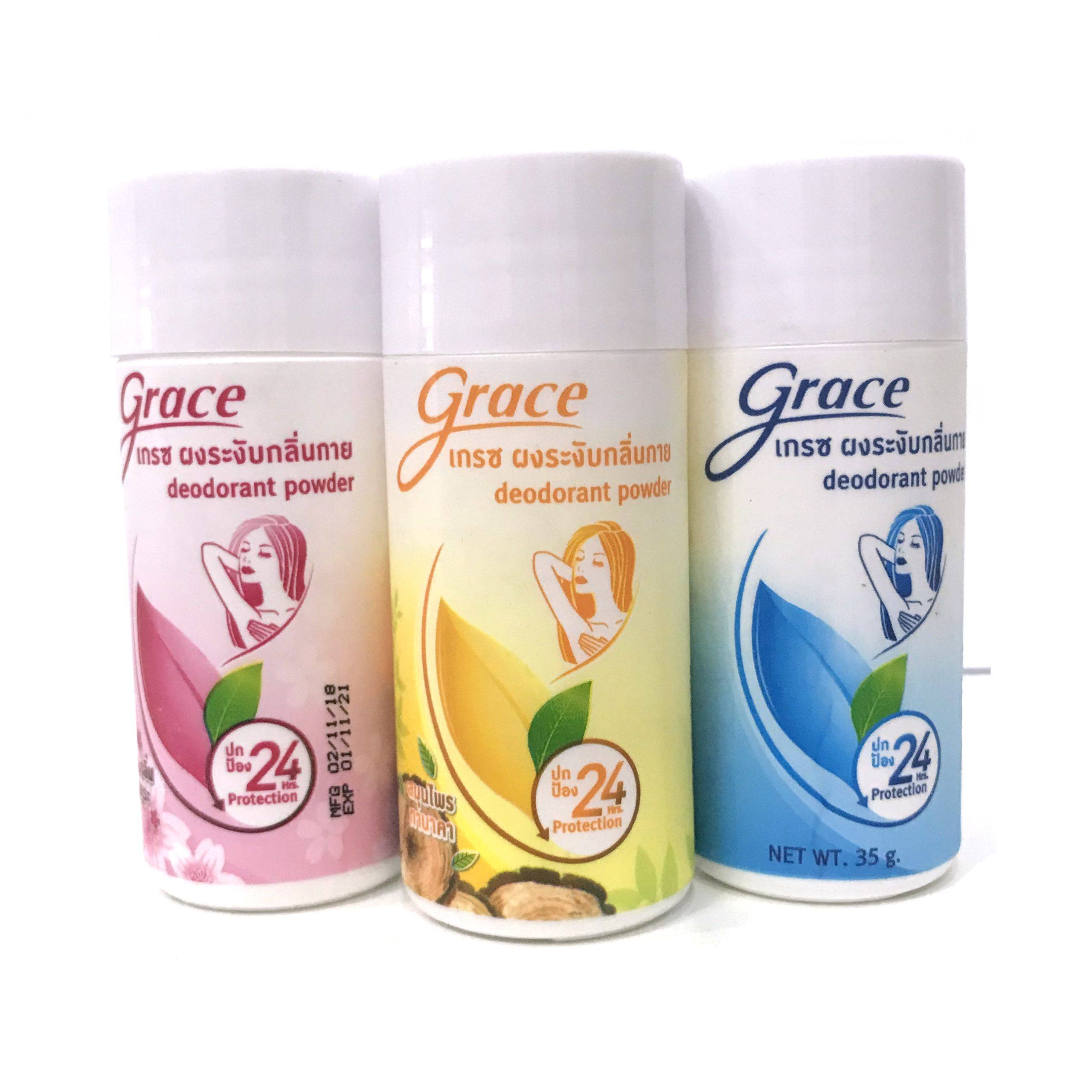 بودرة مزيلة للروائح Grace هي منتج طبيعي فعال لمنع الروائح الكريهة الناتجة عن التعرق. منتج شهير في تايلاند، يوفر حماية طويلة الأمد لمدة 24 ساعة مع العناية بالبشرة.