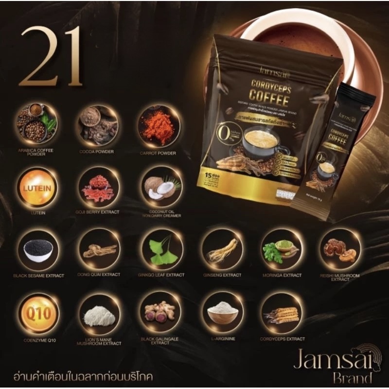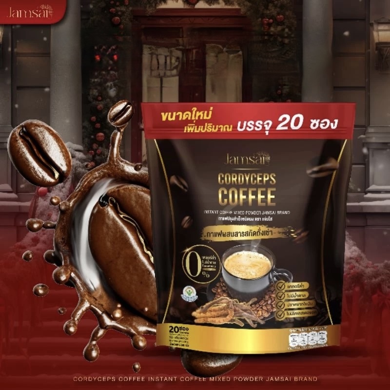 Jamsai Coffee est un café instantané enrichi de 22 extraits naturels, dont le cordyceps doré, reconnu pour ses nombreux bienfaits sur la santé. Conçu pour allier plaisir et bien-être, il convient à tous, y compris aux personnes âgées ou souffrant de diabète ou d’hypertension.