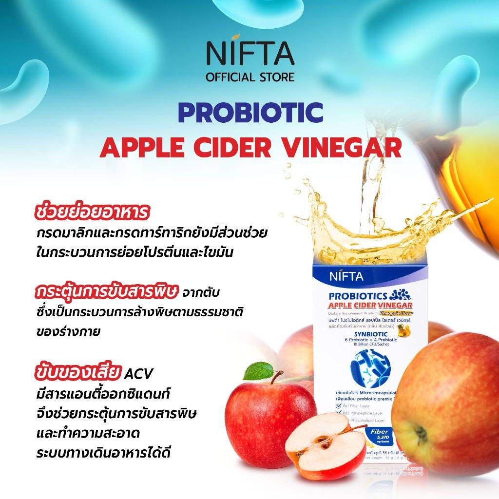 NIFTA Probiotics Apple Cider Vinegar هو مكمل بروبيوتيك متكامل يدعم صحة الجهاز الهضمي ويعزز المناعة من خلال تركيبة فريدة تحتوي على البروبيوتيك والبريبيوتيك وخلاصة الخل الطبيعي.