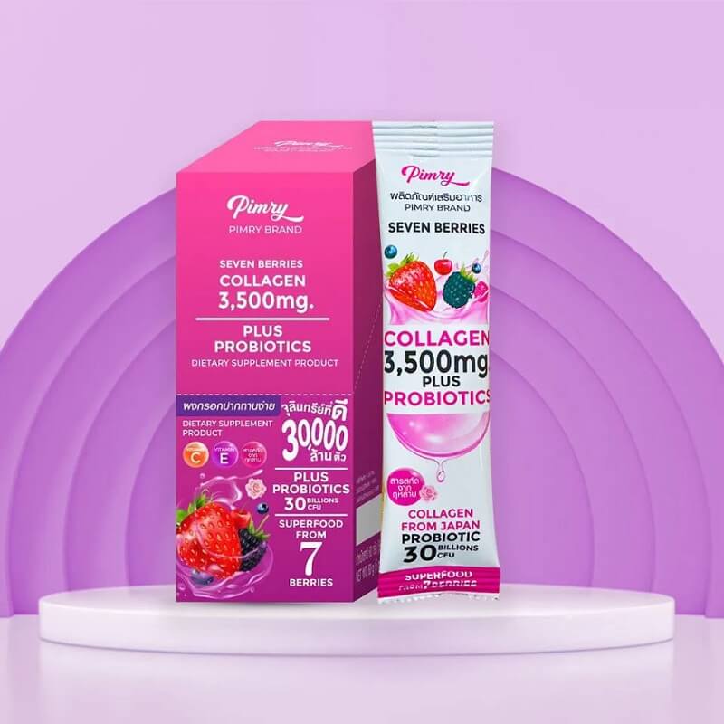 Pimry Seven Berries Collagen 3500 mg مع البروبيوتيك هو مكمل غذائي متقدم يحتوي على 12 كيساً في العبوة، كل كيس 5 غرام.