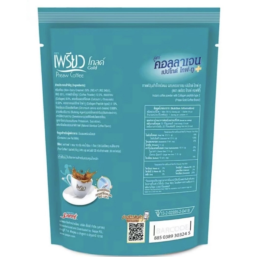 Preaw Coffee Collagen Type True est un café spécialement conçu pour la gestion du poids et l’apport en calcium. Il contient du chrome amino-acide chélaté et du collagène Type True, idéal pour ceux qui souhaitent renforcer leurs os, articulations et tendons tout en maintenant un poids équilibré.