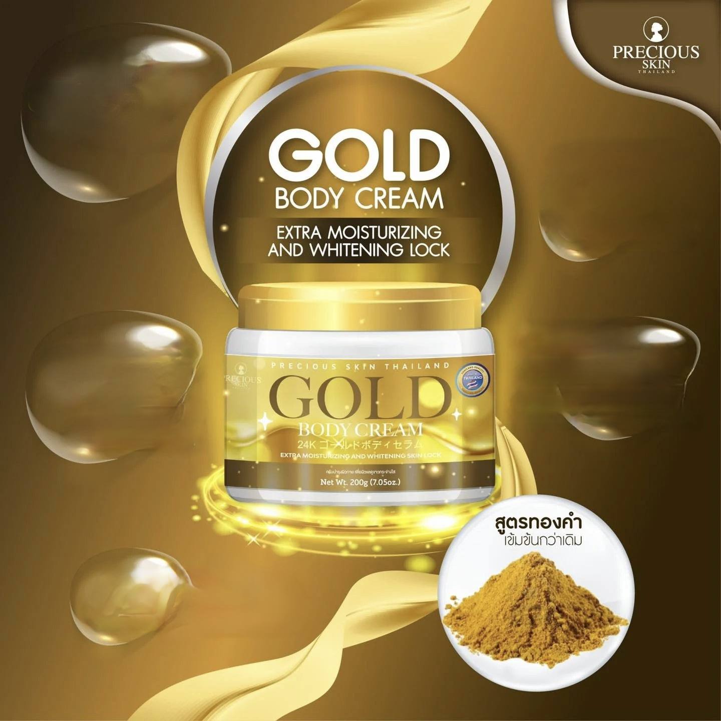 Crème Corps Or Precious Skin Thailand, spécialement formulée pour hydrater et nourrir intensément la peau. Elle aide à restaurer l’hydratation, laissant la peau douce, souple et rebondie. Sa texture légère pénètre rapidement sans laisser de film gras, ce qui la rend idéale pour une utilisation de jour comme de nuit.