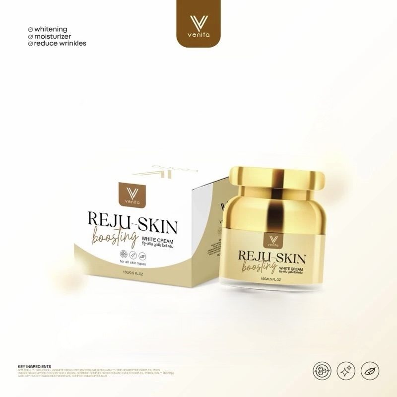 Reju-skin Venita Boosting White Cream 15 g هو كريم تفتيح وترطيب الوجه من Venita، مصمم للعناية اليومية صباحاً ومساءً. يعمل هذا الكريم الفاخر على ترطيب البشرة بعمق، تعزيز نضارتها وإعادة حيويتها مع الحفاظ على إشراقتها الطبيعية.
