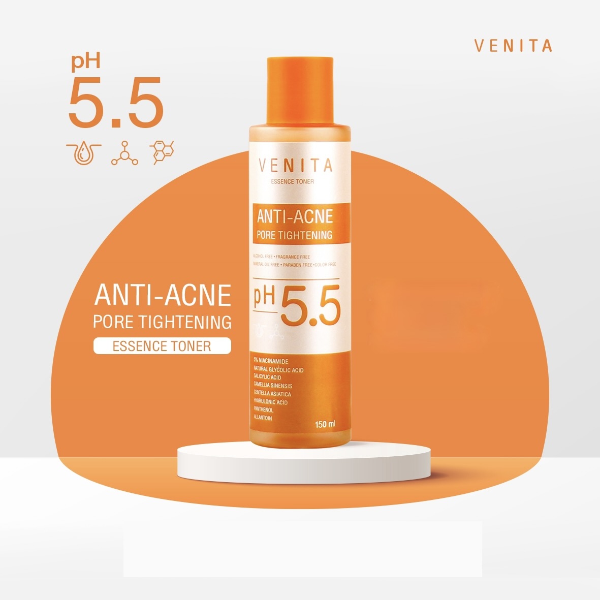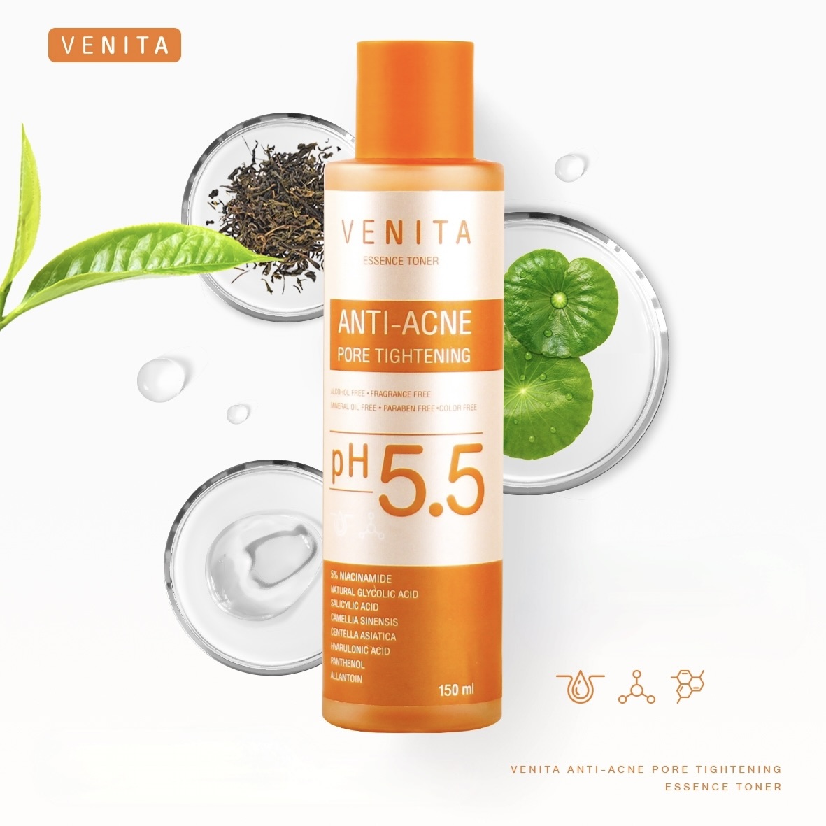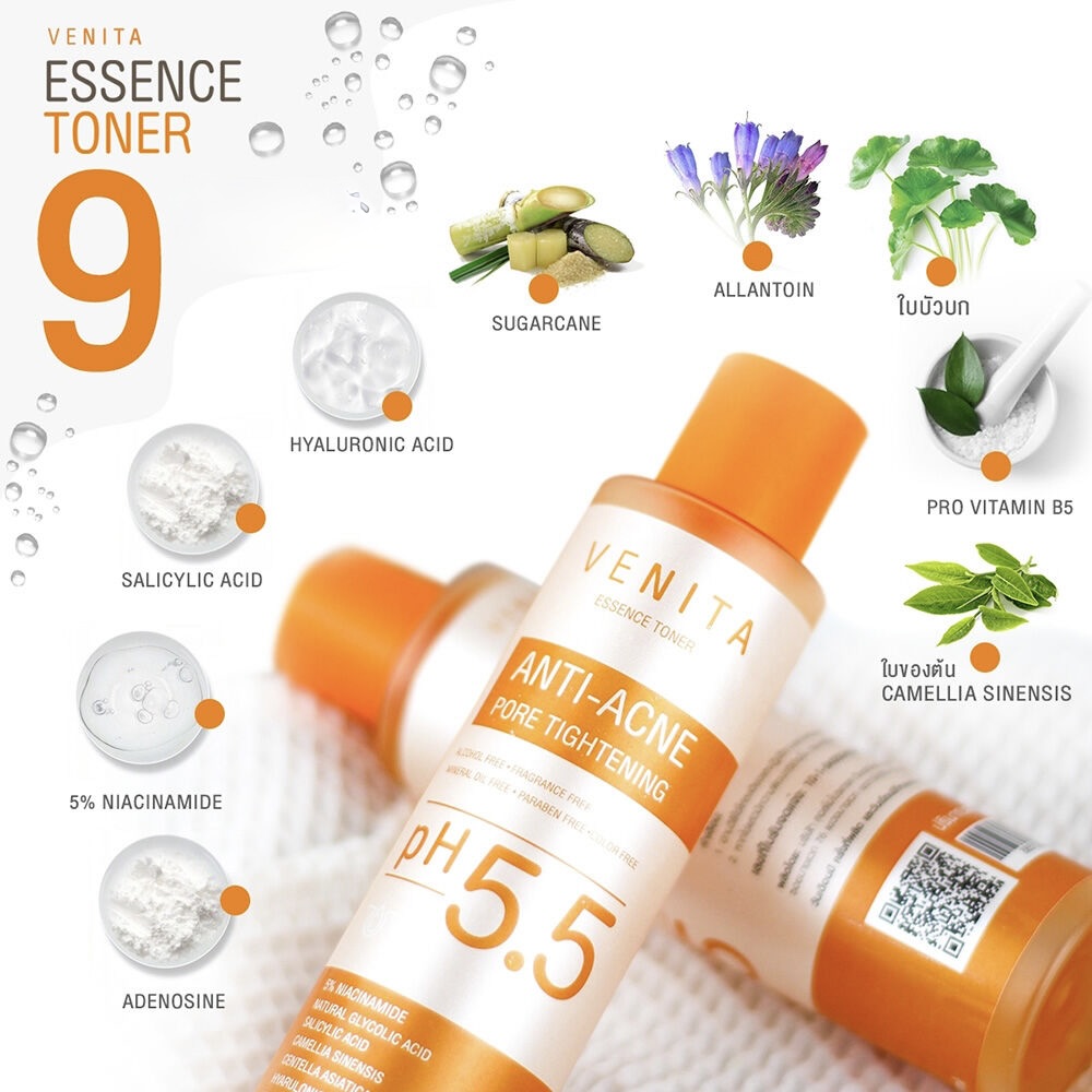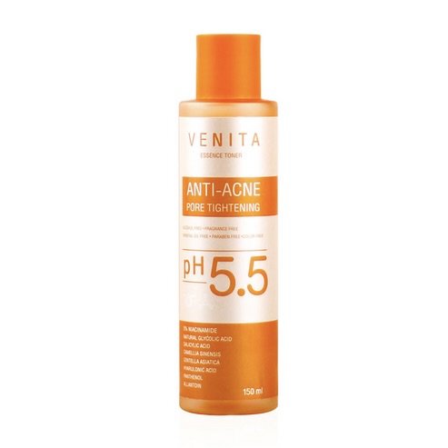 Venita Anti-Acne Pore Tightening Essence Toner 150 ml هو تونر وعناية جوهرية للبشرة مخصص للبشرة المعرضة لحب الشباب، المسام الواسعة والعيوب المتكررة. يحتوي التونر على 9 مكونات فعالة تعمل على تقليل الدهون الزائدة، تنظيف المسام، تهدئة الالتهابات، الحد من لمعان البشرة، وتقليل آثار حب الشباب.