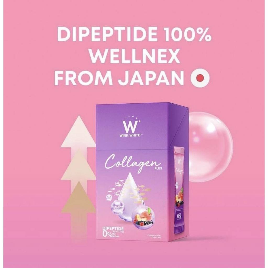 WINK WHITE W Collagen Plus هو مكمل كولاجين مبتكر من Wellnex، مستورد من اليابان، يحتوي على Replenwell-Dipeptide بتركيز 10,000 مجم لتعزيز امتصاص الكولاجين حتى مستوى الخلية.