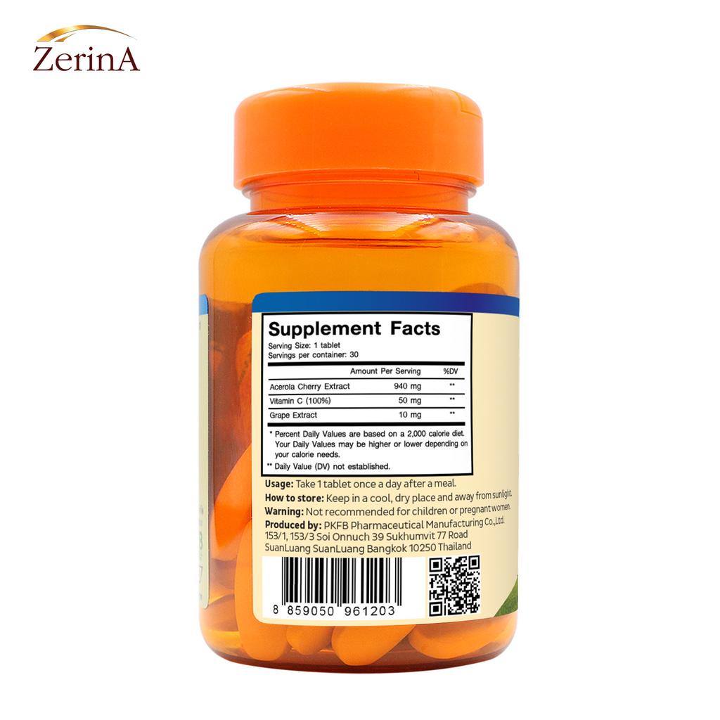 مكمل فيتامين سي من كرز الأسيرولا بتركيبة عالية التركيز لدعم المناعة وصحة البشرة. يحتوي كل قرص على 940 ملغ من مستخلص الأسيرولا الطبيعي، 50 ملغ فيتامين C نقي بنسبة 100%، و10 ملغ مستخلص بذور العنب الغني بمضادات الأكسدة.